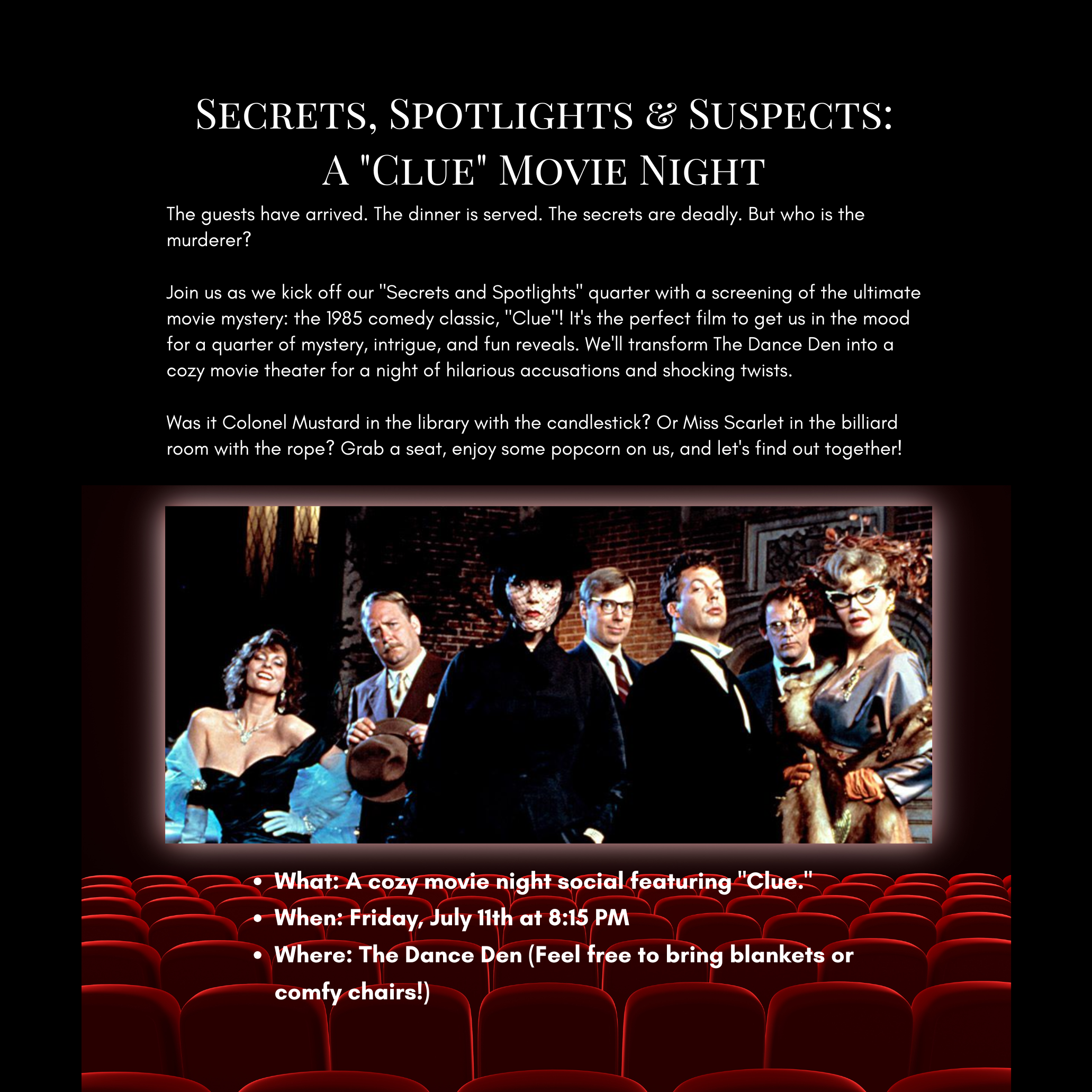 Join us as we kick off our "Secrets and Spotlights" quarter with a screening of the ultimate movie mystery: the 1985 comedy classic, "Clue"! It's the perfect film to get us in the mood for a quarter of mystery, intrigue, and fun reveals. We'll transform The Dance Den into a cozy movie theater for a night of hilarious accusations and shocking twists.